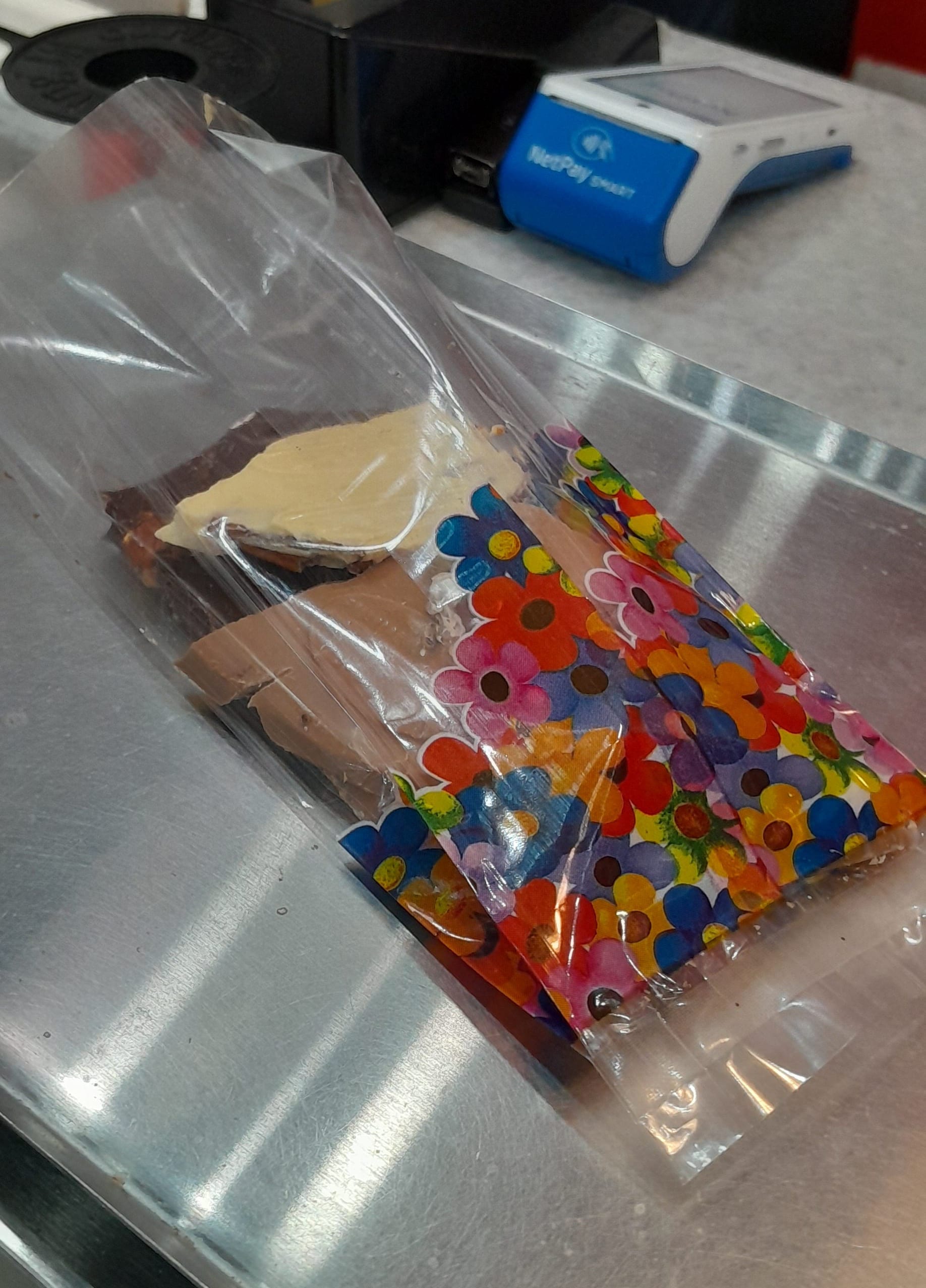 Da una sensación de adrenalina romper esa placa grande de chocolate con las pinzas. No puedes calcular los gramos, así que es fácil llevarte pedazos enormes. Los 100 gramos costaban 105 pesos. Tomé un poco de cada tipo de chocolate para degustarlo en casa y con toda la tranquilidad del mundo, pero no ocurrió así. Nos los comimos antes.