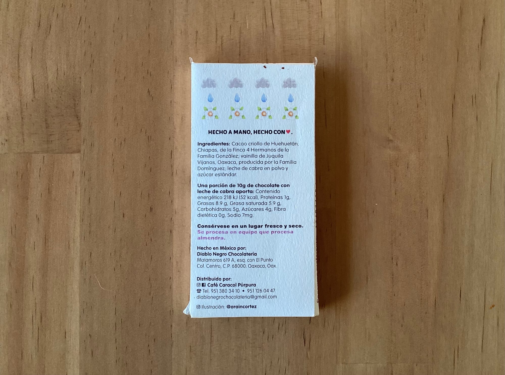 La tableta es pequeña y cabe en una mano. Tiene el personaje de una niña cabra alegre, una ilustración hecha por @araincortez, cuyo perfil de instagram está repleto de estos personajes realizados para otros chocolates. Son tiernos y encantadores. Te hacen sonreír cuando los ves. Y eso se agradece.
