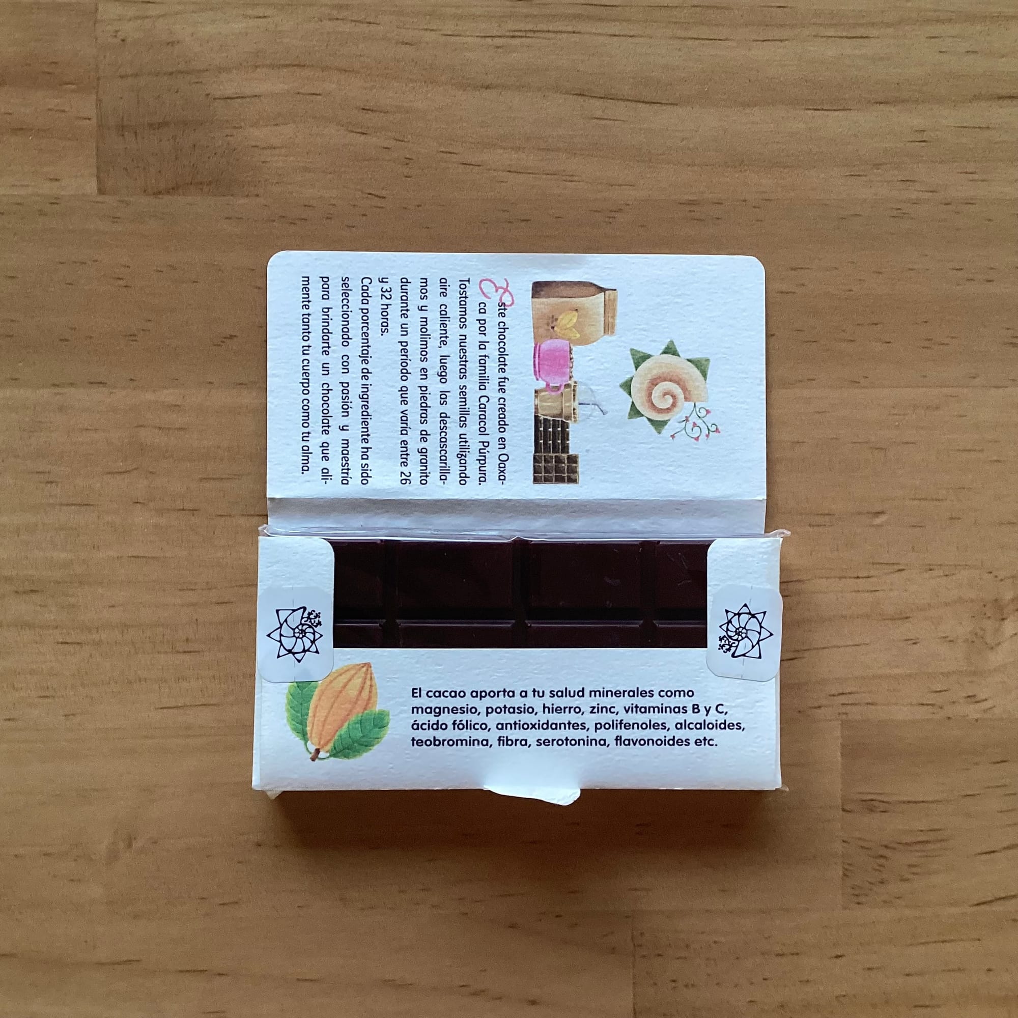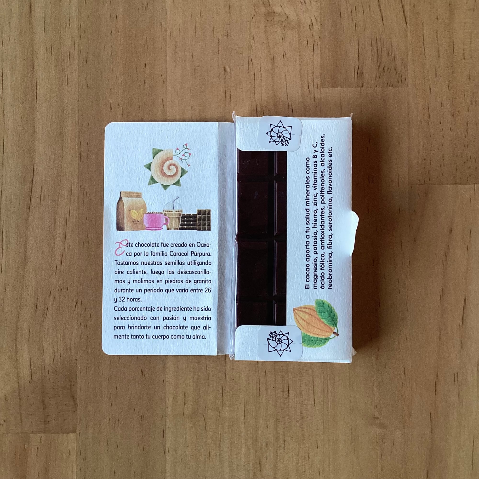 Esta barrita de chocolate la reconocí por su diseño. Ya las había visto antes. Son de Caracol Púrpura