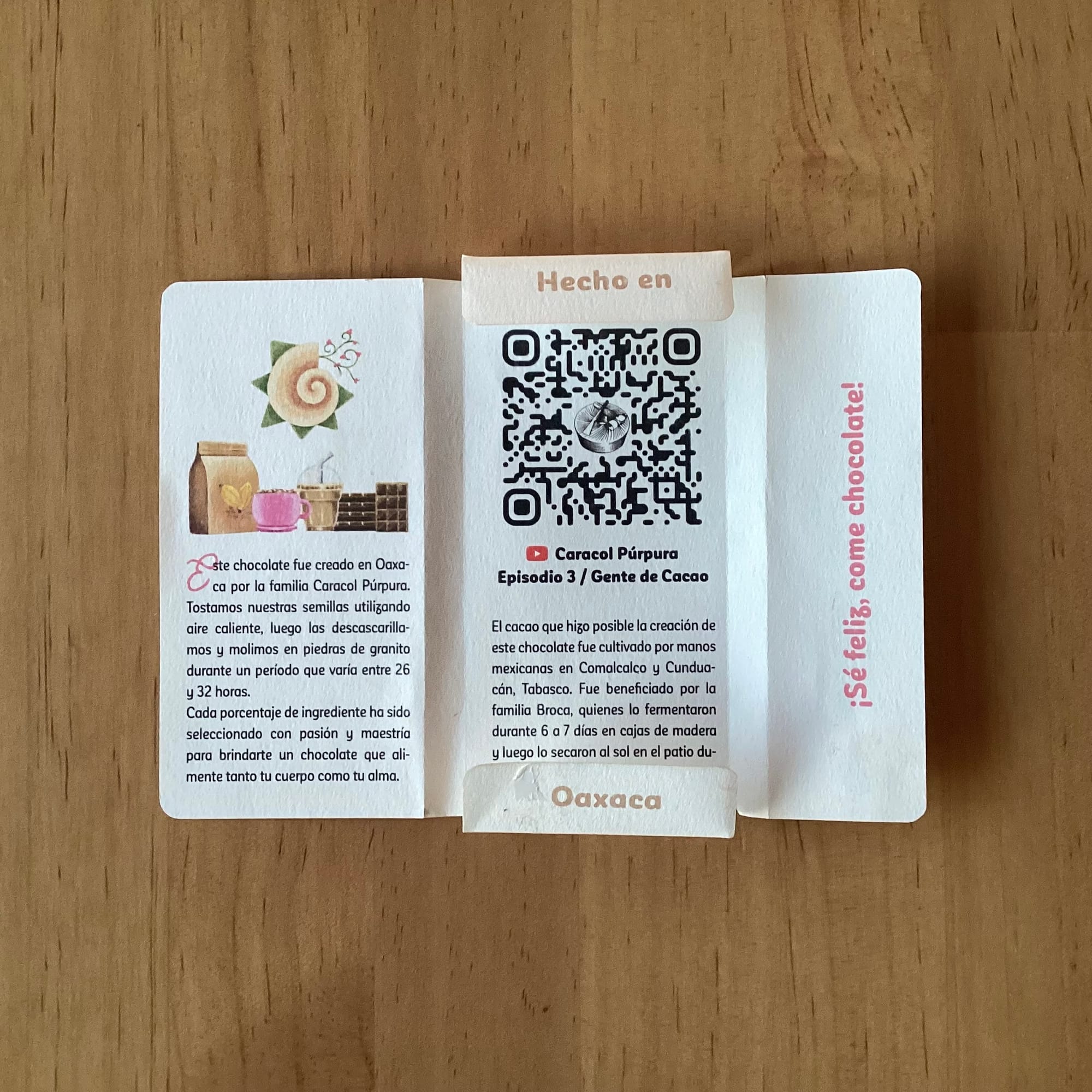Abrí el chocolate y encontré un código QR; que te lleva a un mini documental. En una pestaña, una leyenda invita a ser feliz y comer chocolate. También podría ser al revés, come chocolate y sé feliz. Pero lo que me detuvo fue el olor. Es un aroma que dan ganas de envasar para cuando se me presenta la temible y odiosa ansiedad.
