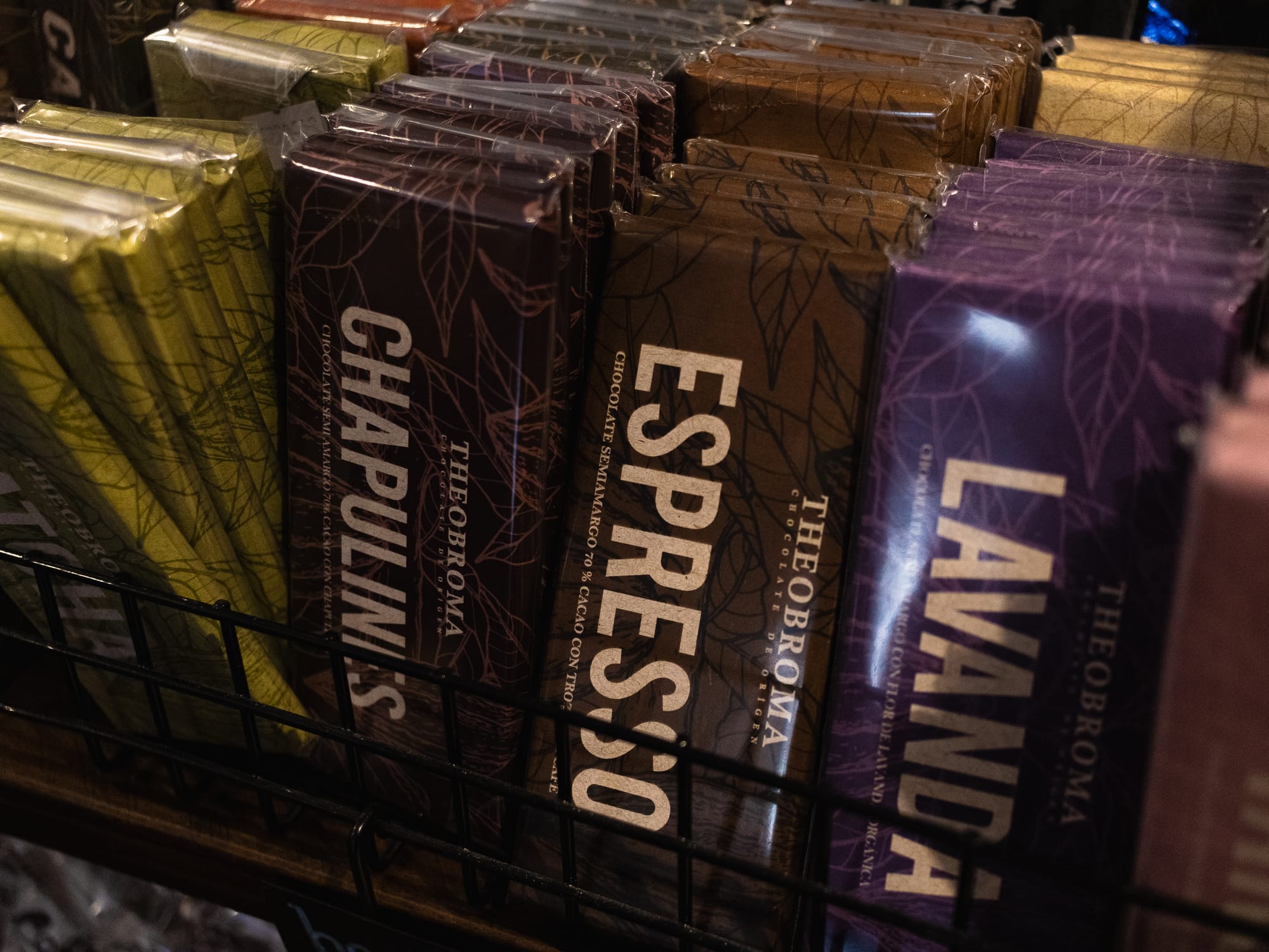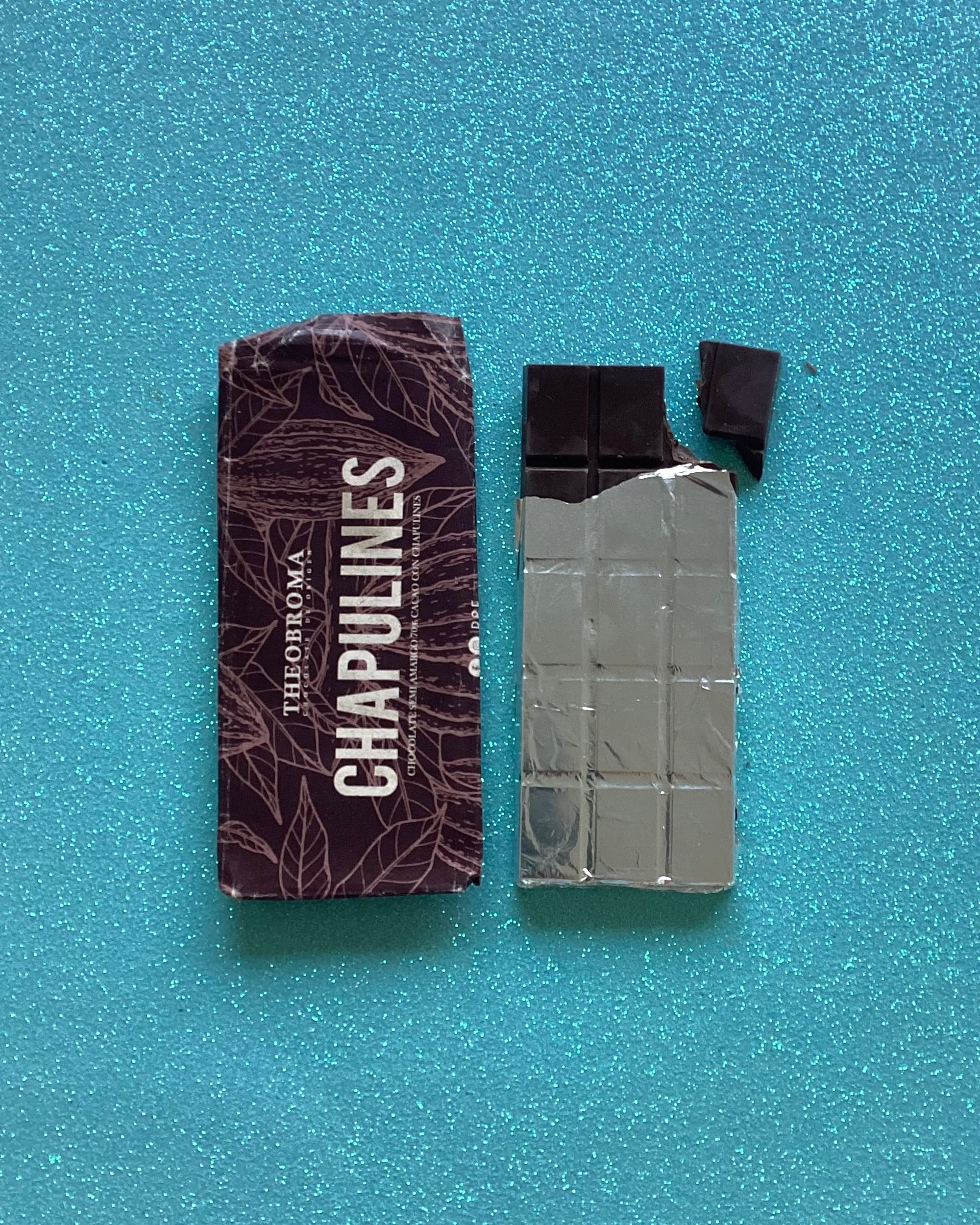 En el centro de Puebla, hay una chocolateria llena de curiosidades y especímenes de chocolate. Nos detuvimos shi para husmear y adquirir esta barrita de chocolate sin muchas indicaciones al respecto más que su porcentaje de cacao y con un extraño ingrediente saltarín: chapulines salados y crujientes que contrastan con el chocolate un poco dulce.