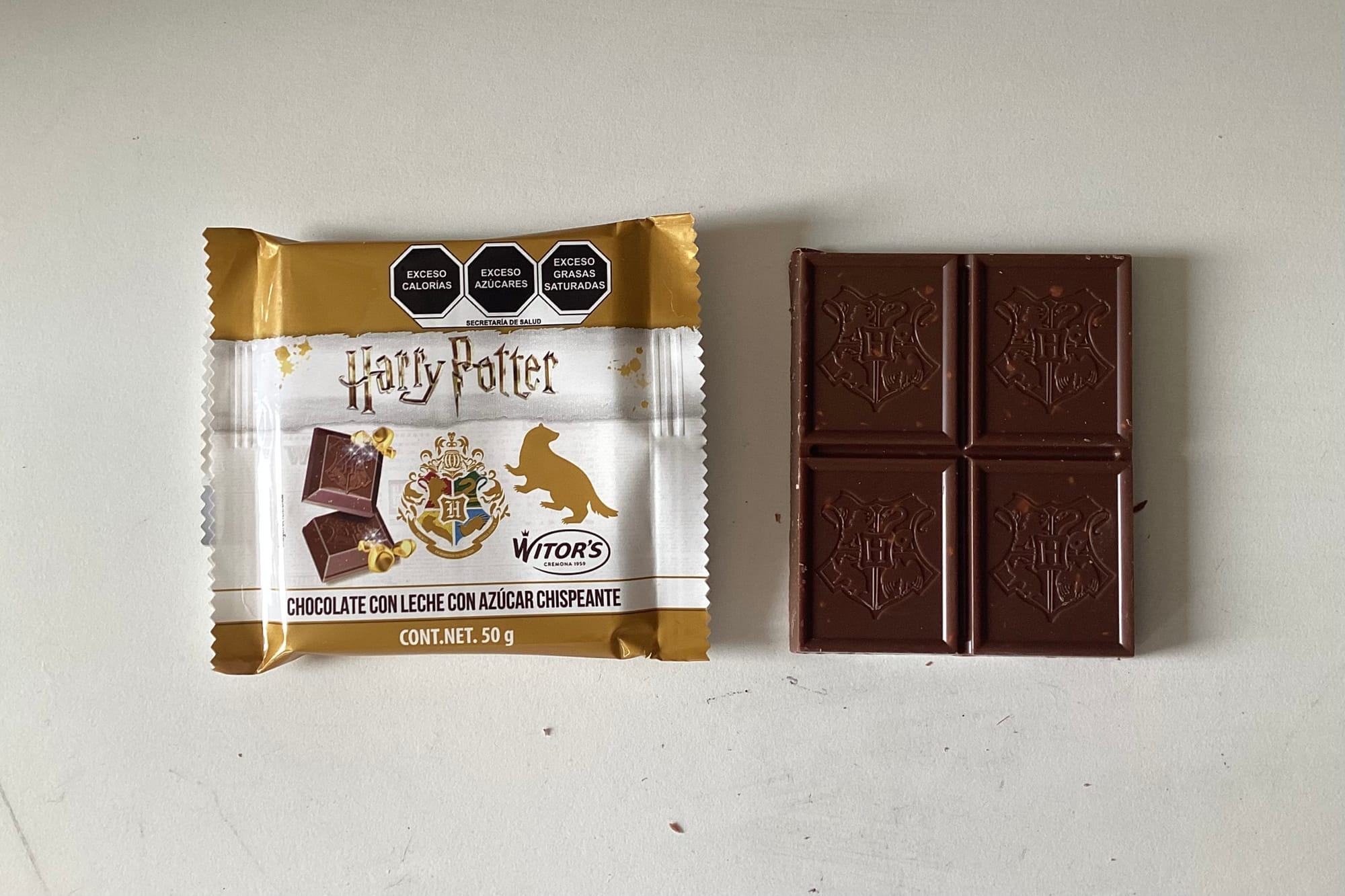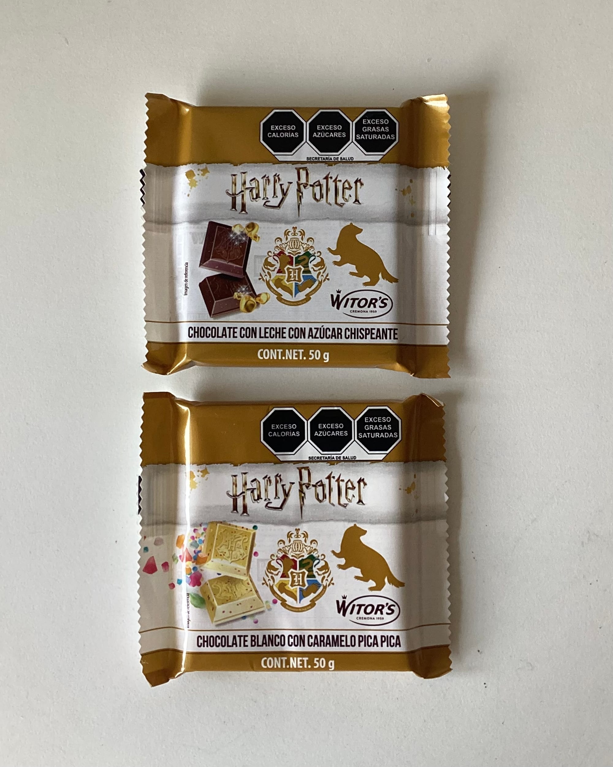 Justo ahora que la maquinaria arranca de nuevo para este estreno navideño, comprobé que la nostalgia sigue vendiendo. Caí en la trampa al ver este par de barras de chocolate en un pasillo de Walmart, adornadas con la inconfundible tipografía de la saga y el majestuoso escudo de Hogwarts. Inmediatamente me remonté a aquellas viejas conversaciones sobre el papel de Snape —oh no, cuán equivocadas estábamos contigo, Severus—. La promesa en el empaque no era solo azúcar, sino "Caramelo Pica Pica" y "Azúcar Chispeante". La aventura me estaba llamando.